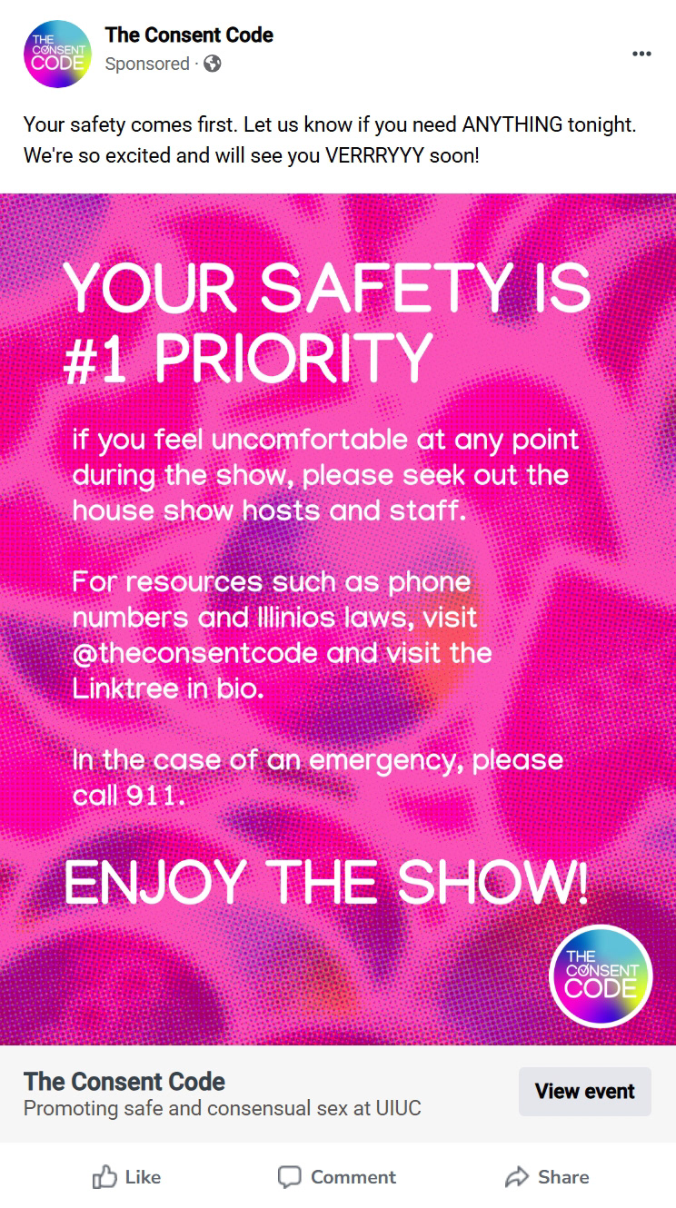 This event marked a turning point for The Consent Code, transforming it from a school project into a movement. We engaged the Champaign-Urbana community with flyers, stickers, and branded “condom pops,” emphasizing safe and consensual sex.